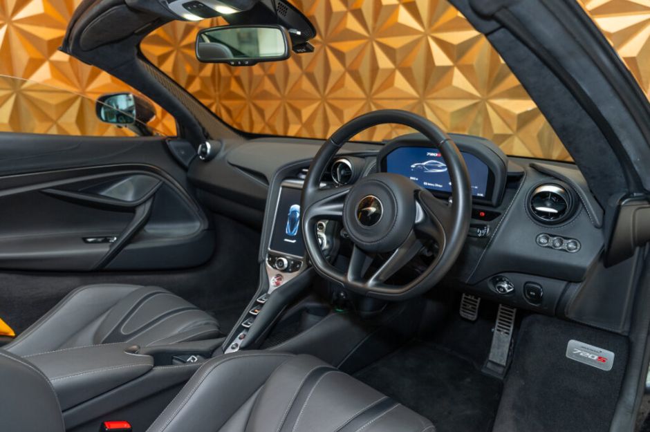 Finished in sophisticated Black paintwork, this 720S exudes an understated yet purposeful presence that perfectly complements its aerodynamic silhouette. The exterior benefits from McLaren’s meticulous attention to detail, with carbon fibre accents strategically positioned to enhance both aesthetics and performance. The elegant lines flow seamlessly from the distinctive dihedral doors to the integrated rear spoiler, creating a cohesive design that balances form and function in a way few supercars achieve.
